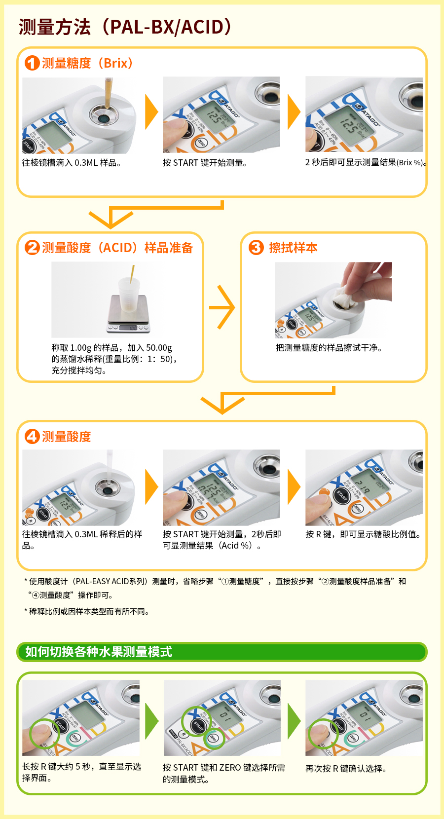 | 測量范圍 酸度(Acid) | 低酸度 0.10~4.00% 高酸度2.50~8.80% (酸度 = 檸檬酸總酸度轉(zhuǎn)換) |