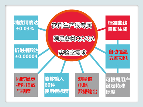 RX-5000α-Bev全自動(dòng)折光儀是能夠內(nèi)部設(shè)定測(cè)量溫度的自動(dòng)折射儀,又稱為糖度折光儀,飲料糖度儀。能夠快速地測(cè)量多種液體的折射率、糖度或各式液體的濃度,具備帕爾貼溫控系統(tǒng),無(wú)需外接循環(huán)水浴。