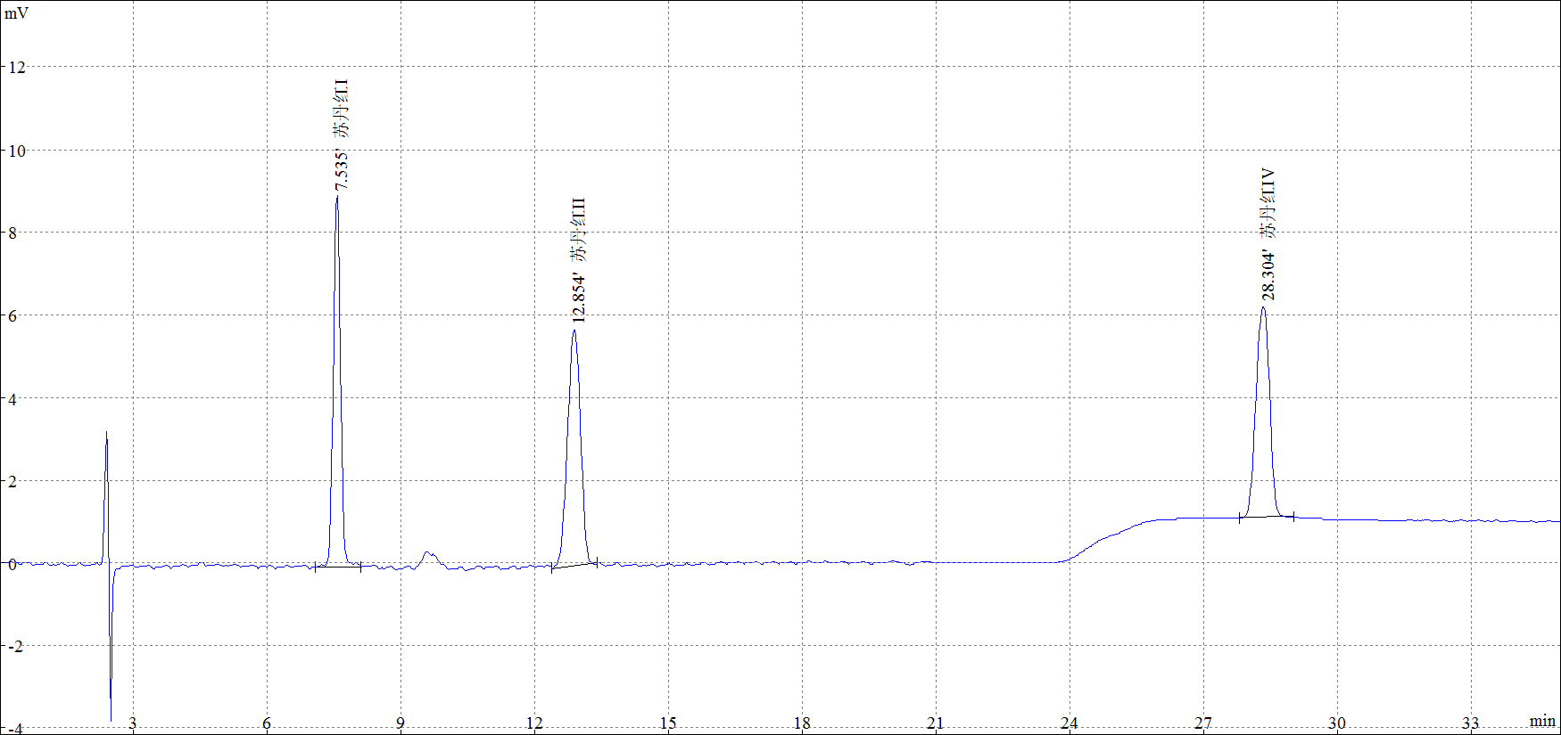 近年來歐盟和我國都嚴禁使用蘇丹紅作為食品添加劑,參考國家標準GB/T 19681-2005《食品中蘇丹紅染料的檢測方法 高效液相色譜法》,我們采用反相高效液相色譜儀對蘇丹紅I號、II號和IV號進行了測定。
