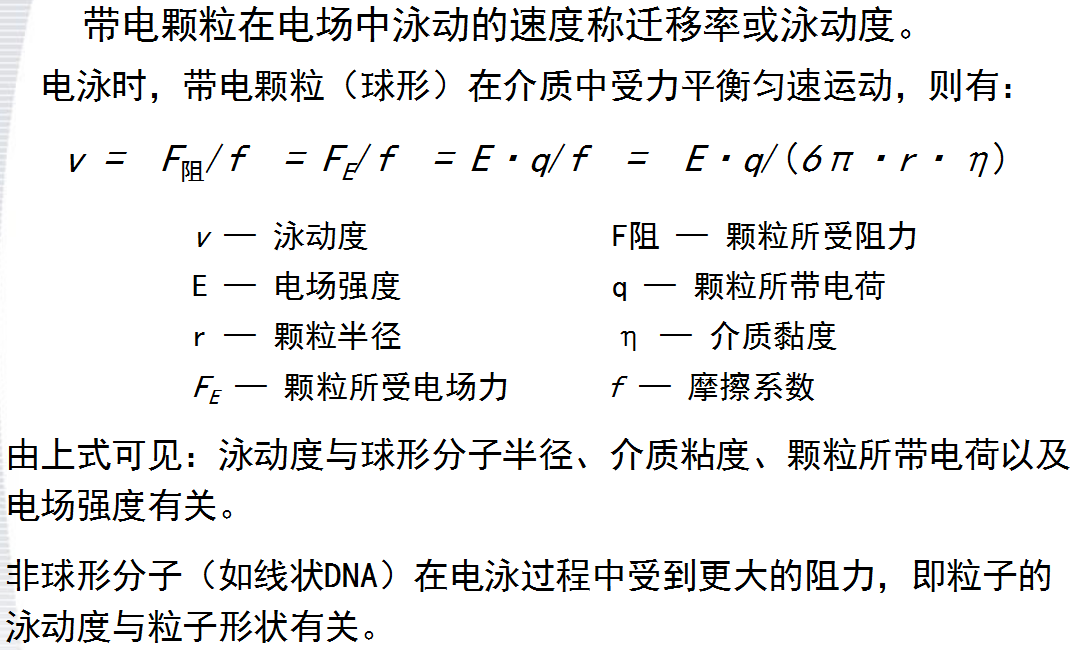 顆粒直徑、形狀以及所帶靜電荷量對泳動(dòng)度有較大的影響。一般來說,顆粒的靜電荷量越大,或其直徑越小,或其形狀越接近球形,在電場中的泳動(dòng)速度就越快。反之,則越慢
